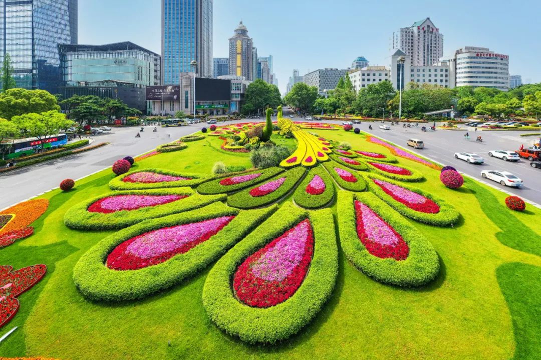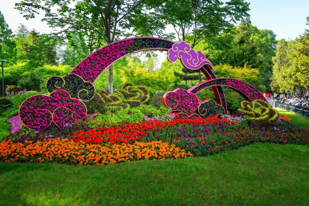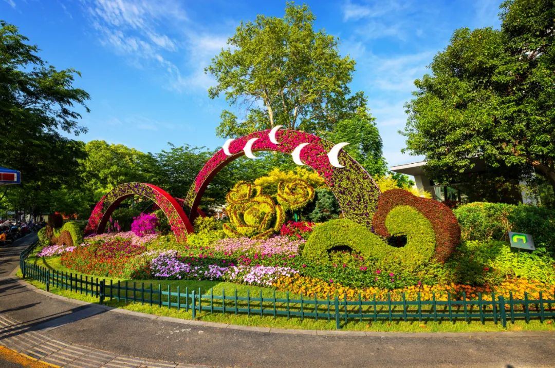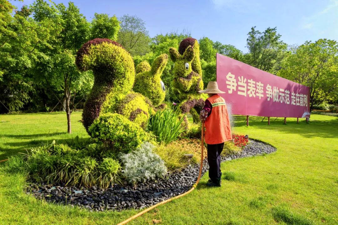 和平公園東園“幸福之門”、西園“飛躍之門”、九華山南坡松鼠等綠雕花境布置,花姿招展、層次錯落的空間感和情景變化,步移景異、栩栩如生。