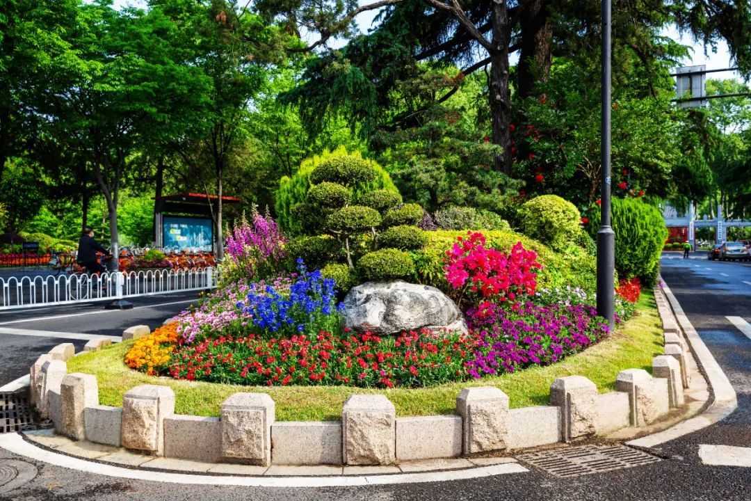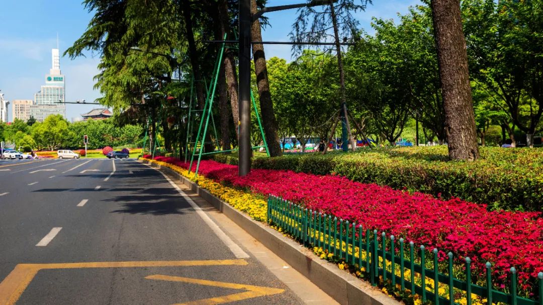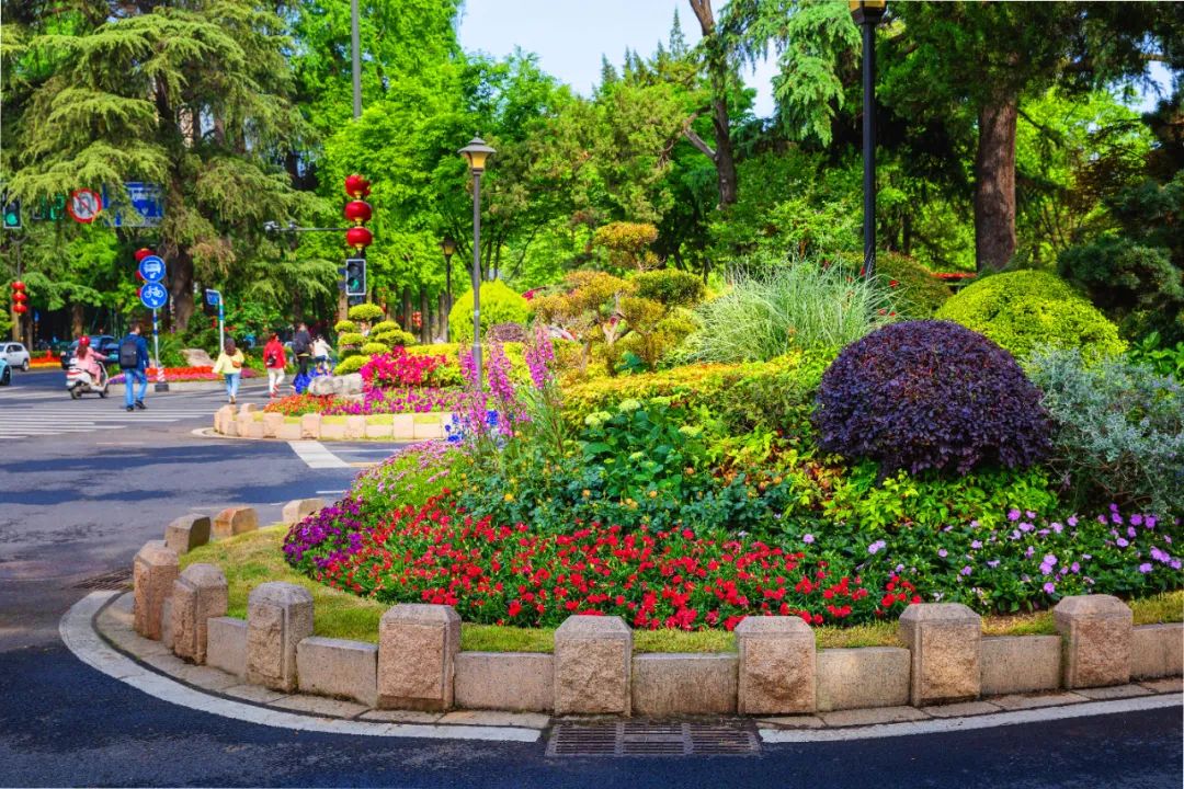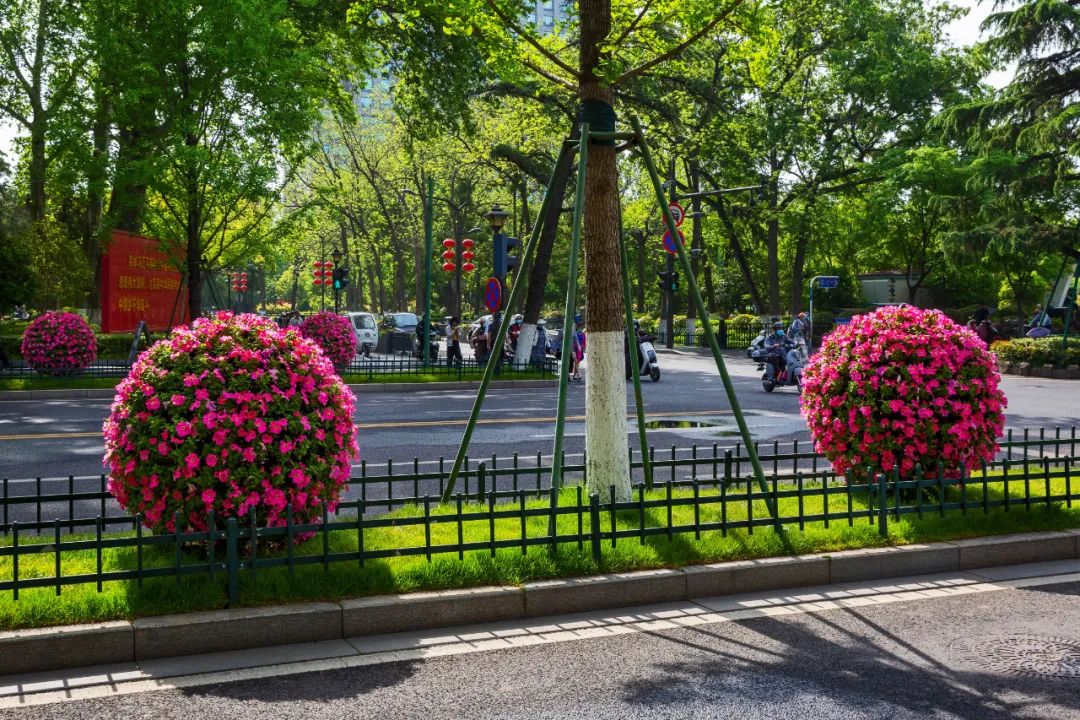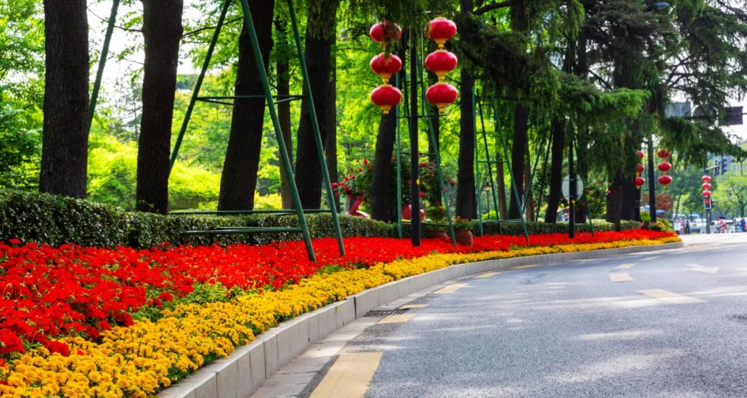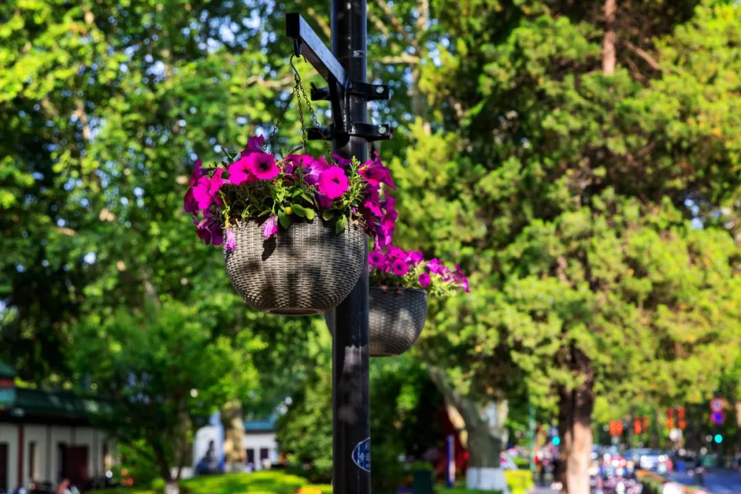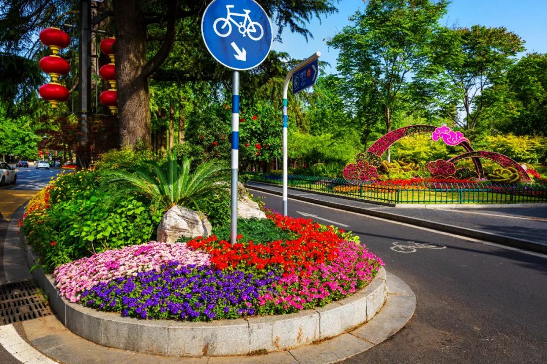 對市府門前路、長江路、九華山站、荔枝廣場、中山門城墻等重要節(jié)點(diǎn)容器花箱、花球、燈桿掛花及新街口東北角綠地進(jìn)行花卉布置,選用朱蕉、羽扇豆、毛地黃、天竺葵、桑貝斯鳳仙、金雀、澳洲朱蕉、變?nèi)~木、四季海棠、鼠尾草、歐石竹、垂掛牽牛等花卉,以色彩鮮明、層次豐富的設(shè)計感,裝扮城市街角,營造濃厚的節(jié)日氣氛。