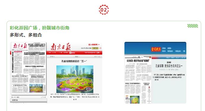 鼓樓中心廣場孔雀綠雕換上新妝、“五福梅花”和12個錯落的幸?;ㄇ蛞陨是逍碌幕ɑ懿贾茫瑺I造出“‘梅’好金陵”的春天氣息。4月25日,《南京日報》、《金陵晚報》等多家媒體對鼓樓中心廣場孔雀綠雕迎五一換妝進(jìn)行報道。